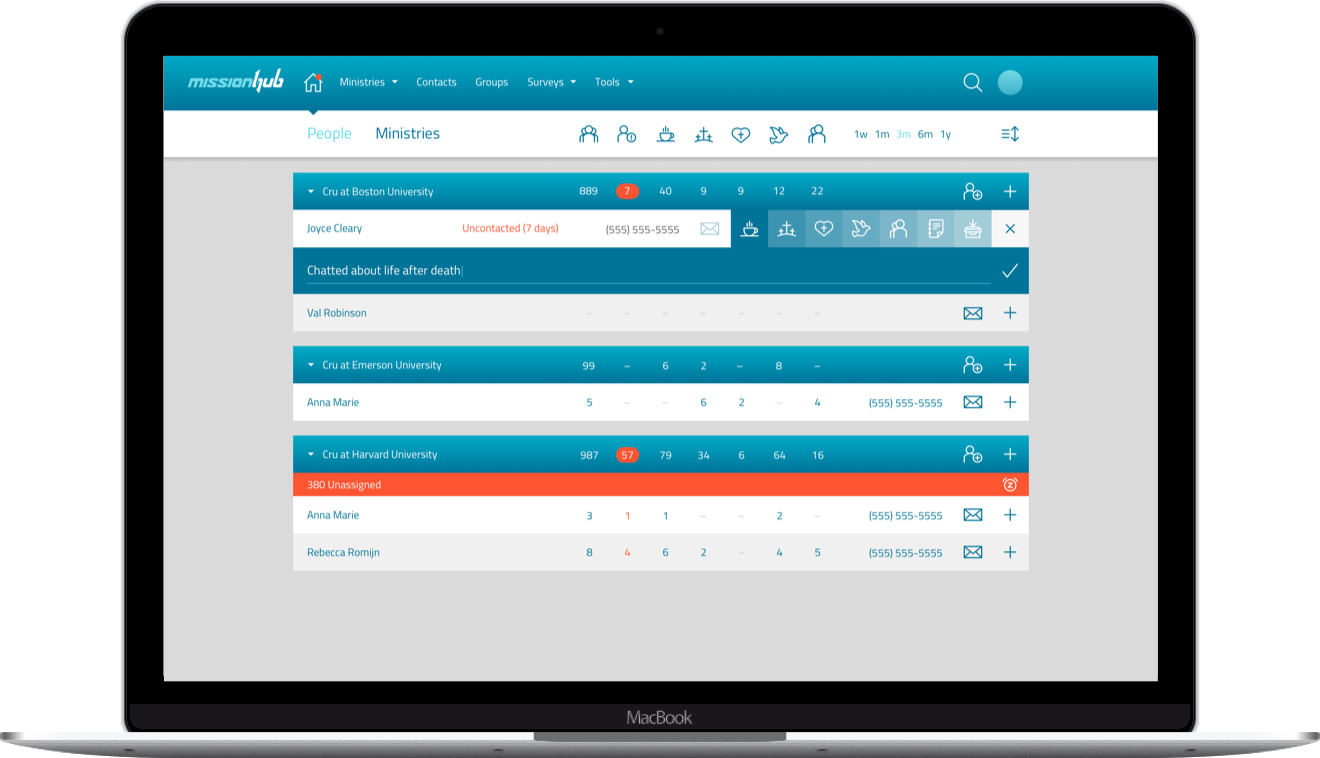 Permanecer en la misión. A medida que crece su Ministerio, necesita ayuda vigilando y organizar la información, para no perder ritmo. Con MissionHub, usted fácilmente puede permanecer conectado a la gente dentro de su Ministerio, de manera eficiente realizar un seguimiento de los detalles importantes que le ayudan a servir bien.